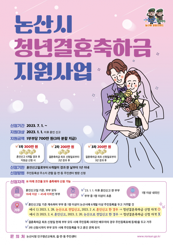 한편 논산시는 지역소멸 위기를 타개하기 위해 결혼 장려 뿐 아니라 충남 남부권 유일의 공공산후조리원 건립 추진, ‘아이키우기 좋은 안전망 조성’을 통한 임산부, 영유아를 위한 24시간 응급진료서비스 체계구축, 소아응급진료 최신식 의료장비 정비 구축 등 새로 탄생하는 가정을 위한 다양한 정책을 펼치고 있다.