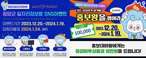 자세한 사항은 청양군 일자리 정보망 누리집에서 확인할 수 있으며 당첨자는 오는 24일 청양군 사회관계망과 일자리 정보망 배너를 통해 발표하고 개별문자로도 통지할 예정이다.