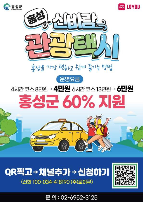 홍성신바람관광택시는 군에서 60% 지원해 관광택시 요금은 4시간 이용 시 9만원에서 4만원으로 6시간 이용 시 13만원을 6만원으로 이용할 수 있다.