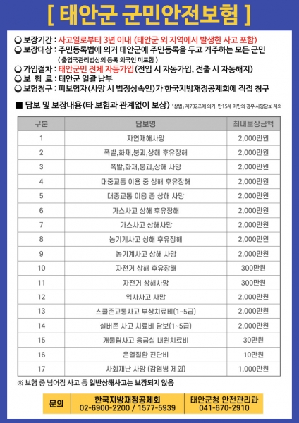 태안군에 주민등록을 두고 거주하고 있는 군민은 별도의 보험가입 절차나 조건 및 가입비 없이 자동으로 가입돼 보험 수익자가 되며 보험기간은 사고 발생일로부터 3년이다.