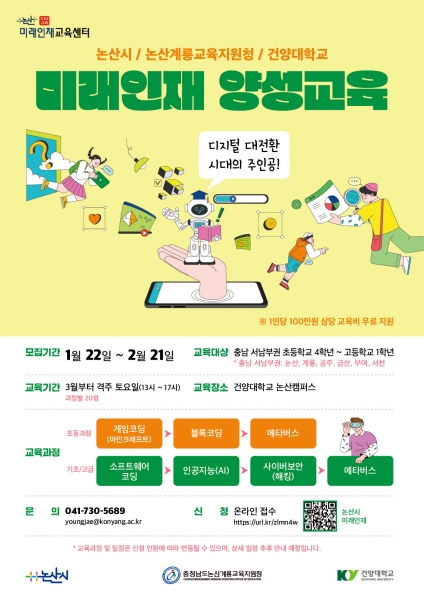 100만원 상당의 교육비가 무료인 미래인재 양성교육의 참가 신청은 온라인으로 가능하며 자세한 사항은 건양대학교 산학협력단으로 문의하면 된다.