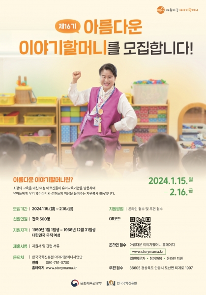 지원방법은 이야기할머니사업단 누리집에서 선발 공고문을 확인 후 오는 2월 16일까지 지원서를 작성해 우편 또는 온라인으로 접수하면 된다.