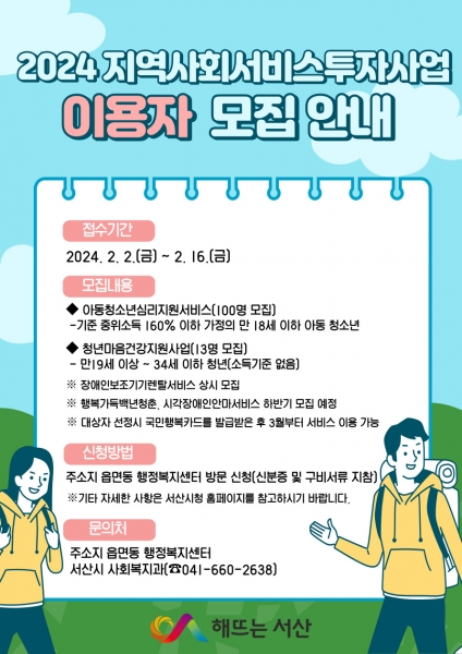 [Ytv영상스토리] 서산시가 지역사회서비스 투자사업 이용자를 2월 2일부터 16일까지 15일간 모집한다.