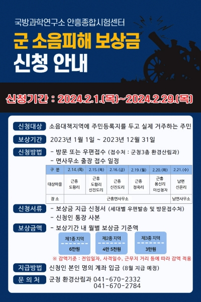 군은 2월 1일부터 29일까지 한 달간 소음대책지역 거주 주민을 대상으로 보상금 신청 접수를 받는다고 밝히고 해당지역 주민들의 많은 관심을 당부했다.