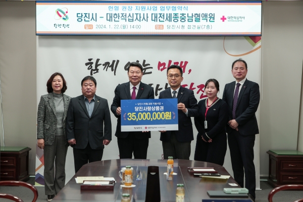 [Ytv영상스토리] 오성환 당진시장과 차정수 대한적십자사 대전세종충남혈액원장은 22일 시청에서 ‘헌혈 권장 지원사업 추진을 위한 업무협약식’을 가졌다 협약에 따라 당진시는 당진사랑상품권 1만원권 3,500장을 대전세종충남혈액원에 지급하고 혈액원은 당진시에서 헌혈한 사람들에게 2월부터 당진사랑 지류상품권 1만원권을 지급한다.