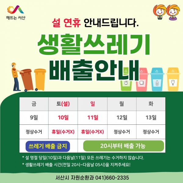 이번 관리 대책은 설 명절 기간에 생활 쓰레기 수거 일정을 홍보해 올바른 일자에 배출하도록 유도하고 생활 쓰레기 민원 사항을 신속히 접수해 처리하기 위해 시행된다.