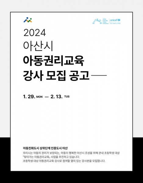 [Ytv영상스토리] 유니세프 아동친화도시 아산시가 초등학생을 대상으로 실시하는 ‘찾아가는 아동권리교육’을 위해 전문강사를 공개모집한다.