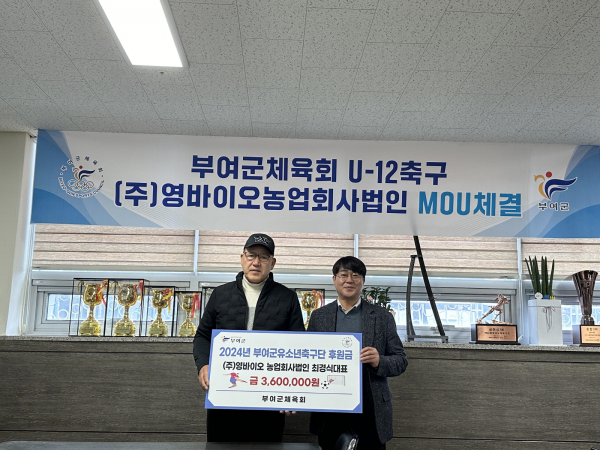 [Ytv영상스토리] 부여군체육회는 지난 1월 31일 ㈜바이오농업회사법인과 부여군 유소년축구단 지원·육성을 위한 업무협약을 체결하고 기탁금 360만원을 전달받았다.
