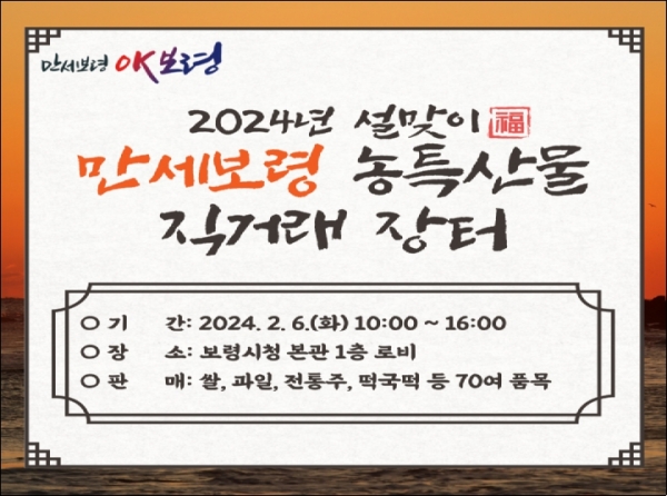 [Ytv영상스토리] 보령시는 설 명절을 앞두고 오는 6일 오전 10시부터 오후 4시까지 보령시청 본관 1층 로비에서‘2024년 설맞이 만세보령 농특산물 직거래장터’를 연다고 밝혔다.