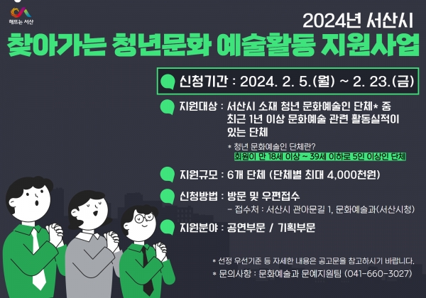 [Ytv영상스토리] 충남 서산시가 청년 문화예술 활성화를 위해 23일까지 ‘2024년 찾아가는 청년문화 예술활동 지원사업’ 참여단체 6팀을 모집한다고 밝혔다.