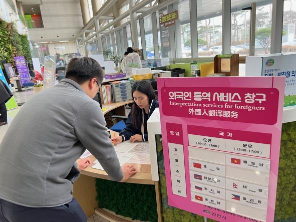이에 의사소통 문제로 민원처리에 어려움을 겪는 외국인을 위해 외국인 통역 서비스 창구를 개설하고 중국, 베트남, 네팔, 캄보디아, 러시아, 필리핀 등 총 6개국 언어를 지원한다.