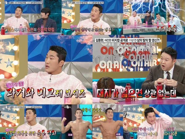 그런가 하면, 신체적 약점보다 예능에서 활약하며 격투기 지망생으로 오해를 받는 게 더 큰 고민이라는 김동현. 격투기 지망생 오해에서 벗어나기 위해 열심히 운동 중이라고 밝힌 그는 과거 ‘라스’에서 공개했던 몸과 비교해 달라며 시원하게 상의 탈의에 나섰다.