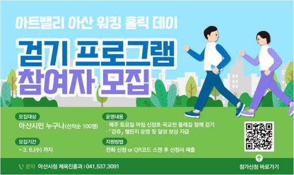 [Ytv영상스토리] 아산시가 건강 걷기 활성화를 위해 ‘아트밸리 아산 워킹 홀릭 데이 걷기 프로그램’과 ‘올바른 건강 참여자 걷기동아리’에 참여할 시민을 모집한다.