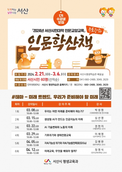 이번 인문학 산책의 테마는 ‘미래 트렌드, 우리가 준비해야 할 미래’이며 ▲우리는 어떤 미래를 준비해야 하는가? ▲생성형 AI가 만드는 인공지능의 미래 ▲AI 기술변화와 노동의 미래 ▲기후위기와 생태전환교육 ▲지속가능성 위기와 지속가능발전목표 ▲미래교육, 무엇을 배워야 할까? 등 6개 강의가 진행된다.