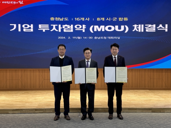 시에 따르면 이날 홍순광 부시장, 김태흠 충남지사, 김대열 ㈜청명 대표이사가 투자협약을 체결하고 협약서를 교환했다.