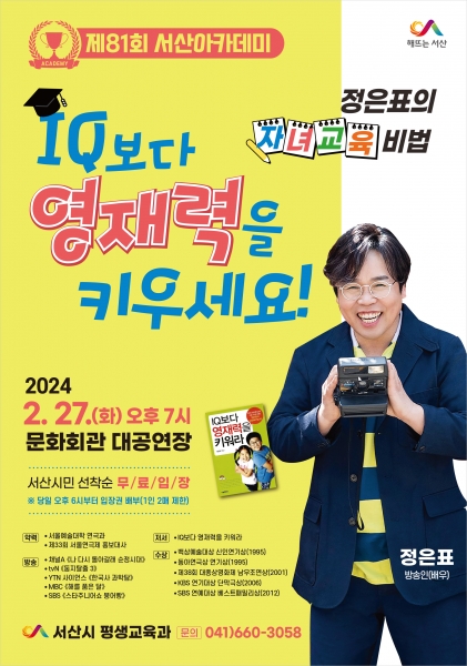 시에 따르면 이번 서산아카데미는 27일 오후 7시 문화회관 대공연장에서 방송인 정은표가 ‘IQ보다 영재력을 키우세요’를 주제로 영재 남매를 키우며 느낀 경험과 비법을 전한다.