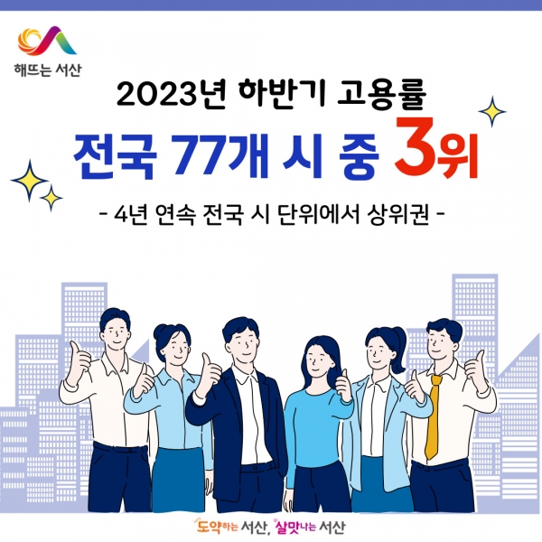 지난 20일 통계청에서 발표한 ‘2023년 하반기 지역별 고용조사 시군구 주요 고용지표’에 따르면 서산시 고용률은 69.8%로 전국 77개 기초단체 시 지역 가운데 3위를 차지했다.