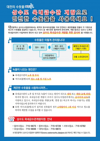 [Ytv영상스토리] 대전시는 맑고 깨끗한 수돗물 공급을 위해 노후 옥내급수관 개량 및 옥상 물탱크 철거 비용 지원 사업을 추진한다.