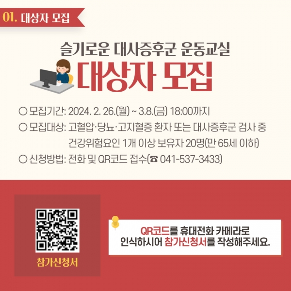 참여 자격은 ▲65세 이하 ▲고혈압·당뇨병·고지혈증 환자 또는 고혈압·당뇨병 등 약물복용 전단계의 아산시민이며 참여 신청은 QR코드 접속 또는 전화 접수로 가능하다.