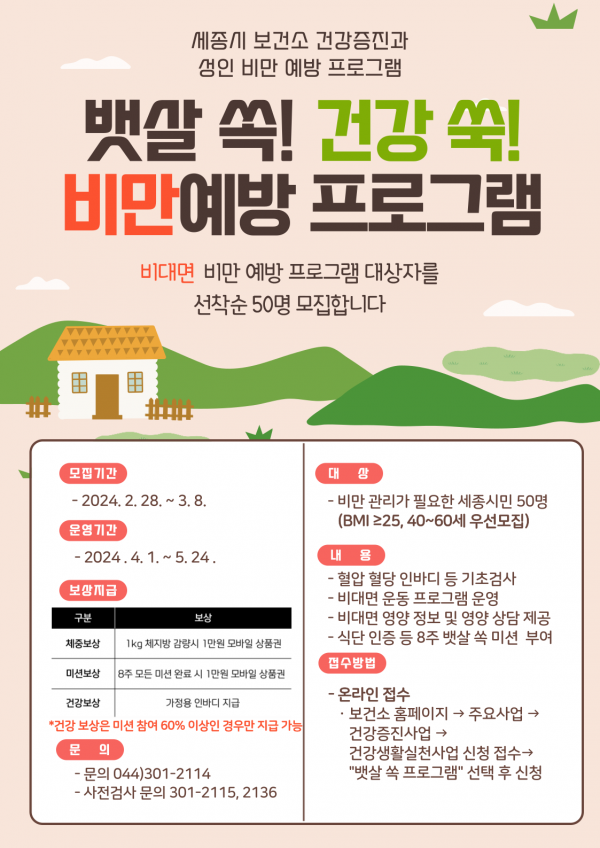 사전검사는 다음달 18일부터 28일까지 세종시 보건소에서 실시하며 본 프로그램은 4월 1일부터 시작된다.
