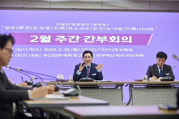 [Ytv영상스토리] 박경귀 아산시장이 26일 시청 상황실에서 열린 주간간부회의에서 “추가로 국비를 확보할 수 있도록, 중앙정부 시책을 적극 분석해 시정과 연계한 도전 분야를 발굴해야 한다”고 강조했다.