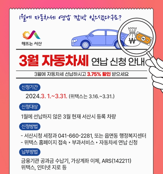 서산시, 1월에 놓친 자동차세 연납, 3월에 3.75% 할인 받으세요