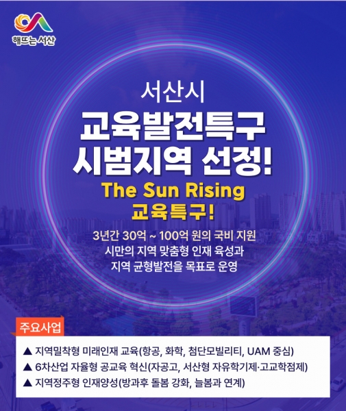 이완섭 서산시장은 “이번 교육발전특구 선정을 계기로 창의력과 미래 경쟁력을 갖춘 인재를 양성하고 지역 교육기관과 산업 일자리를 연계하는 공교육의 혁신을 이루겠다”며 “지역인재 양성이 지역 발전에 기여하고 지역 발전이 지역인재 양성에 기여하는 선순환 체계를 구축해 교육을 선도하는 도시로 도약할 수 있도록 사업 추진에 최선을 다하겠다”고 밝혔다.