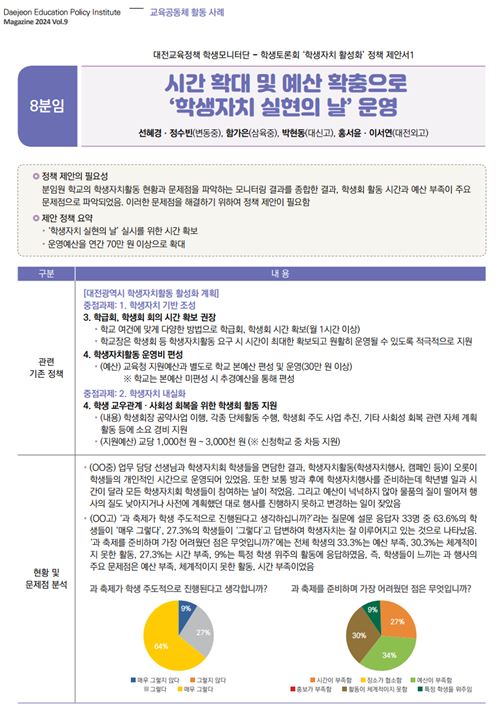 대전교육종단연구 저널은 ‘대전 초·중·고 학생의 학교생활 인식 분석’에 대한 정보를 담았으며 교육공동체 활동 사례에는 대전교육정책 학생 모니터단이 작성한 정책제안서를 수록했다.