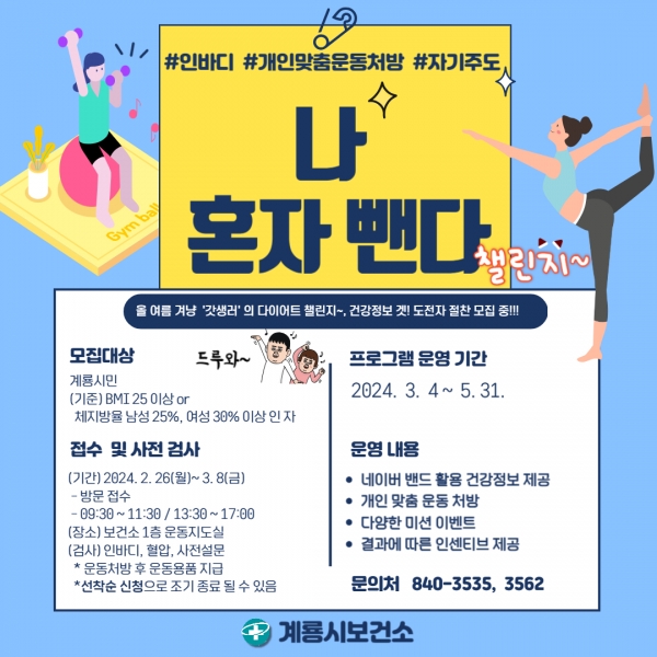 [Ytv영상스토리] 계룡시는 3월부터 5월까지 지역주민 신체활동 증진과 비만예방을 위해 ‘나 혼자 뺀다 챌린지’를 운영한다고 밝혔다.
