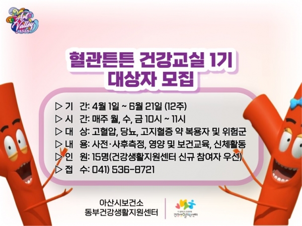 참여 대상은 배방, 탕정, 음봉에 거주하는 고혈압, 당뇨, 고지혈증약 복용자 및 위험군이며 운영 관련 자세한 사항은 아산시 건강증진과로 문의하면 된다.