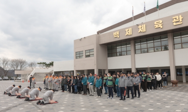 시는 공주소방서 공주경찰서 한국전력공사 공주지사, 공주시 의용소방대, 민방위대원 등 150여명이 참석한 가운데 다중이용시설인 백제체육관 화재 발생 상황을 가정해 초기 진화, 주민 대피, 구조·구급, 복구 훈련을 했다.