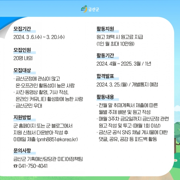 모집인원은 20명 이내로 금산군에 애정과 관심이 많고 글쓰기와 사진, 동영상 촬영이 가능하고 온라인 커뮤니티 활성화에 능숙하면 누구나 지원할 수 있다.