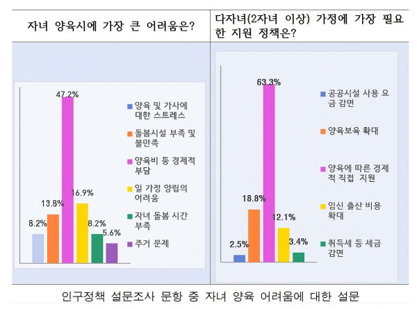 ‘자녀양육시 가장 큰 어려움’을 묻는 항목에서도 ▲경제적 부담 ▲일·가정 양립 ▲돌봄시설 부족 순으로 답했다.