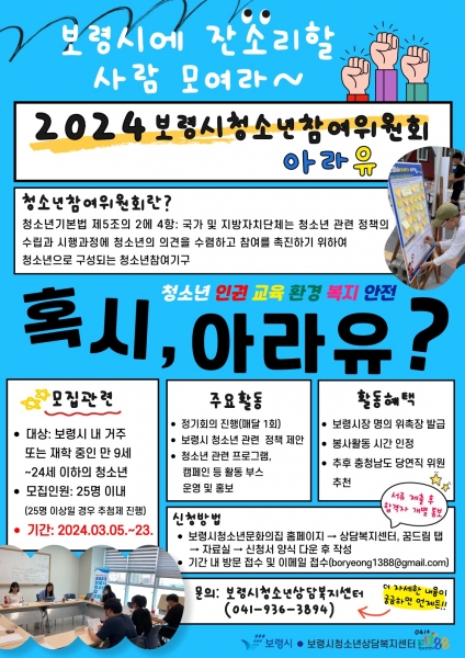 [Ytv영상스토리] 보령시청소년상담복지센터는 오는 3월 23일까지 2024년 보령시 청소년참여위원회‘아라유’의 신규 위원을 모집한다.