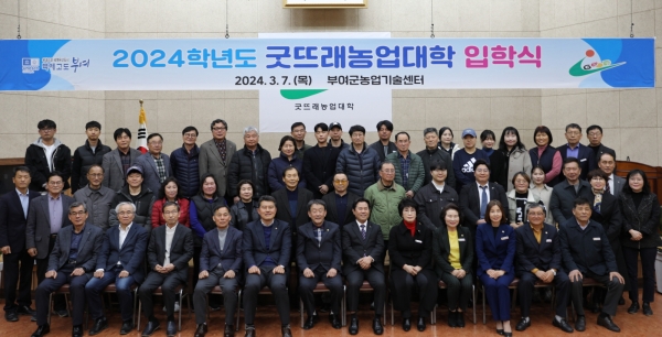 [Ytv영상스토리] 부여군은 지난 7일 부여군농업기술센터 대강당에서 스마트농업과 26명, 경영마케팅과 36명 등 학생 62명을 선발해 2024학년도 굿뜨래농업대학 입학식을 개최하고 본격적인 학사일정에 들어갔다.