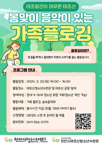 [Ytv영상스토리] 천안시청소년재단은 천안시태조산청소년수련관이 오는 23일 태조산 공원에서 개최 예정인 ‘봄맞이 음악이 있는 가족플로깅’ 프로그램에 참여할 가족을 모집한다고 밝혔다.