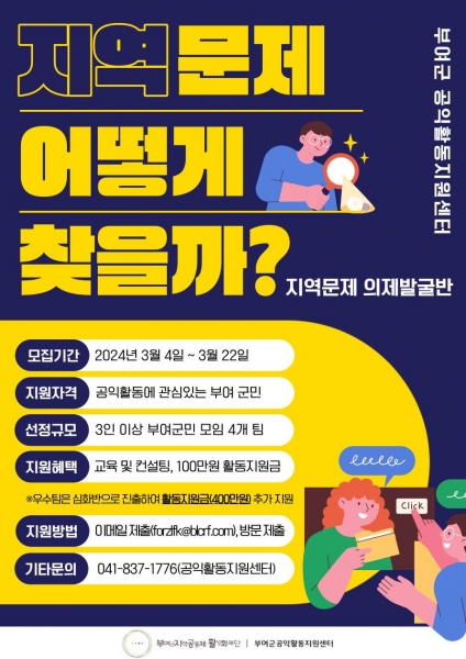 신청은 3월 22일까지 이메일 또는 방문 접수하며 기타 궁금한 사항은 부여군공익활동지원센터로 문의하면 된다.