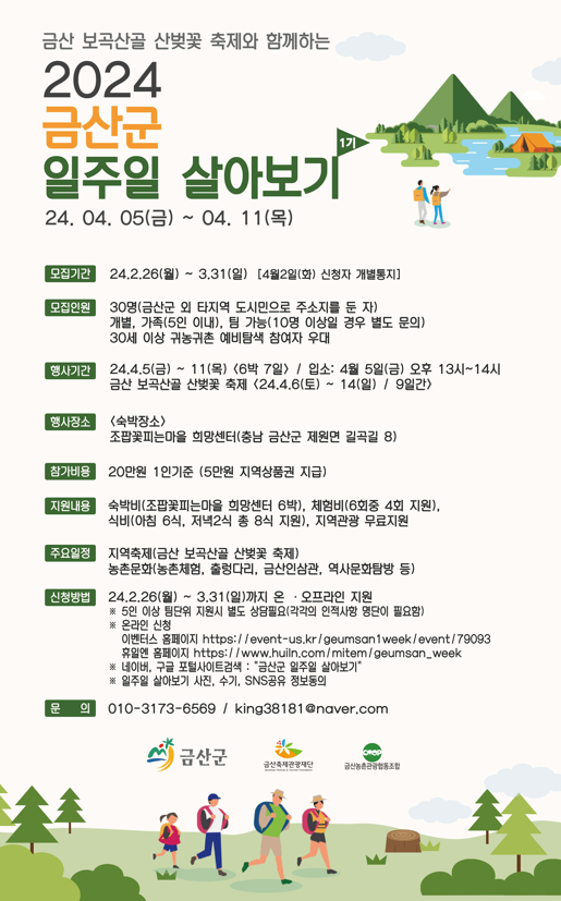 2024년 금산군 일주일 살기 프로그램에 관한 자세한 내용은 모집 담당자에게 문의하면 된다.