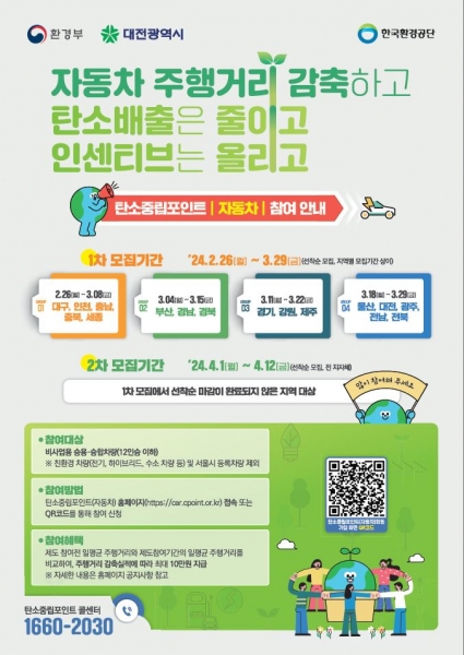 박도현 대전시 환경녹지국장은 “친환경 운전과 대중교통 이용 등으로 차량의 온실가스 배출을 줄여 탄소중립도 실현하고 인센티브도 받을 수 있는 자동차 탄소중립포인트제에 시민들의 많은 관심과 참여를 당부드린다”고 말했다.