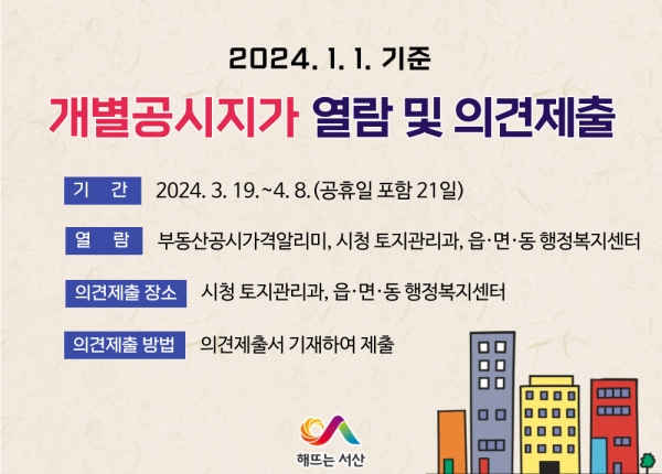 서산시, 2024년 1월 1일 기준 개별공시지가 열람·의견제출