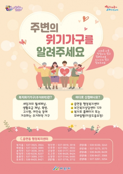 이기석 사회복지과장은 “1인 가구 비율의 증가는 소통과 정보의 부재를 가져온다 주거취약가구 주민들이 더 어려워지기 전에 지역에서 많은 관심을 갖을 수 있도록 복지서비스 알림에 노력하겠다”고 말했다.