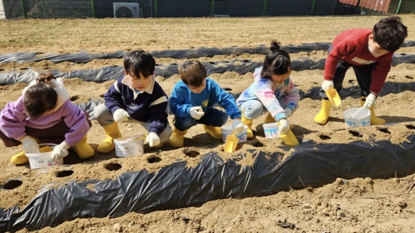 [Ytv영상스토리] 아산 흰돌유치원은 3월 14일에 유치원 텃밭에서 감자 심기 체험활동을 진행했다.