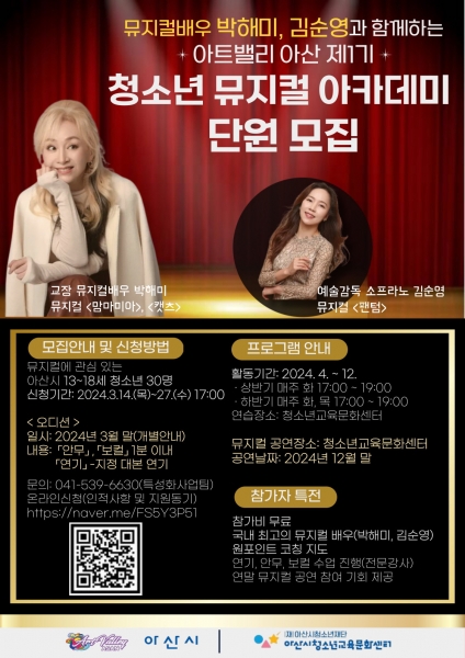 [Ytv영상스토리] 아산시는 오는 27일까지 뮤지컬 배우 박해미와 소프라노 김순영이 함께하는 ‘아트밸리 아산 제1기 청소년 뮤지컬 아카데미’에 참여할 아산시 13~18세 청소년 단원을 모집한다.