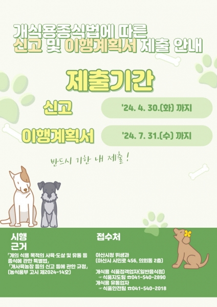 시는 ▲개식용 도축·유통 운영신고서 ▲개식용 식품접객업 운영신고서 ▲개식용종식 이행계획서를 제출받는다고 밝혔다.