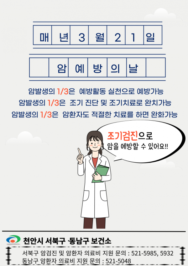 암예방의 날은 세계보건기구가 암 발생의 1/3은 예방이 가능하고 1/3은 조기진단으로 완치가 가능하며 1/3은 적절한 치료로 완화 가능해 ‘3-2-1’을 상징해 만든 기념일이다.