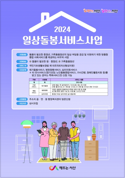 [Ytv영상스토리] 충남 서산시가 22일 시민들의 일상생활의 어려움을 해소하고 삶의 질 향상을 위해 ‘일상돌봄 서비스’사업 대상자를 본격 모집한다고 밝혔다.