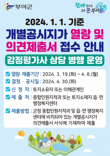 부여군, 2024년 1월 기준 개별공시지가 지가 열람 및 의견제출 접수