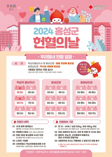 자세한 헌혈 일정은 대한적십자사 홈페이지‘헌혈버스 찾기’또는‘레드커넥트’앱을 설치하면 편리하게 확인할 수 있으며 헌혈에 참여한 홍성군민에게는 1회당 1만원 상당의 홍성사랑상품권 지급과 헌혈증서 발급, 4시간 봉사활동 인정 등을 지원한다.