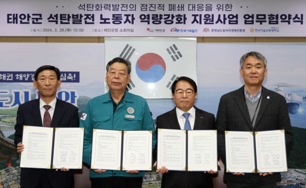 군은 28일 군청 소회의실에서 가세로 군수를 비롯해 한국서부발전 박형덕 사장, 충청남도일자리경제진흥원 김찬배 원장, 한국기술교육대학교 산학협력단 민준기 단장 등이 참석한 가운데 ‘태안군 석탄발전 노동자 역량강화 지원 업무협약’을 체결했다고 밝혔다.