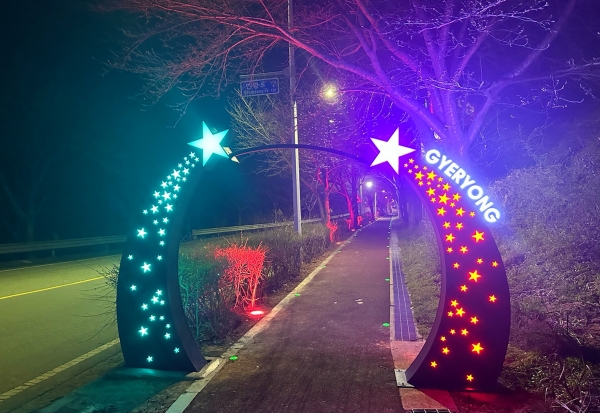 [Ytv영상스토리] 계룡시가 향적산 벚꽃길의 시작점인 엄사중~향한리 회전교차로 약 1㎞ 구간에 아름다운 경관조명의 불을 밝힌다.